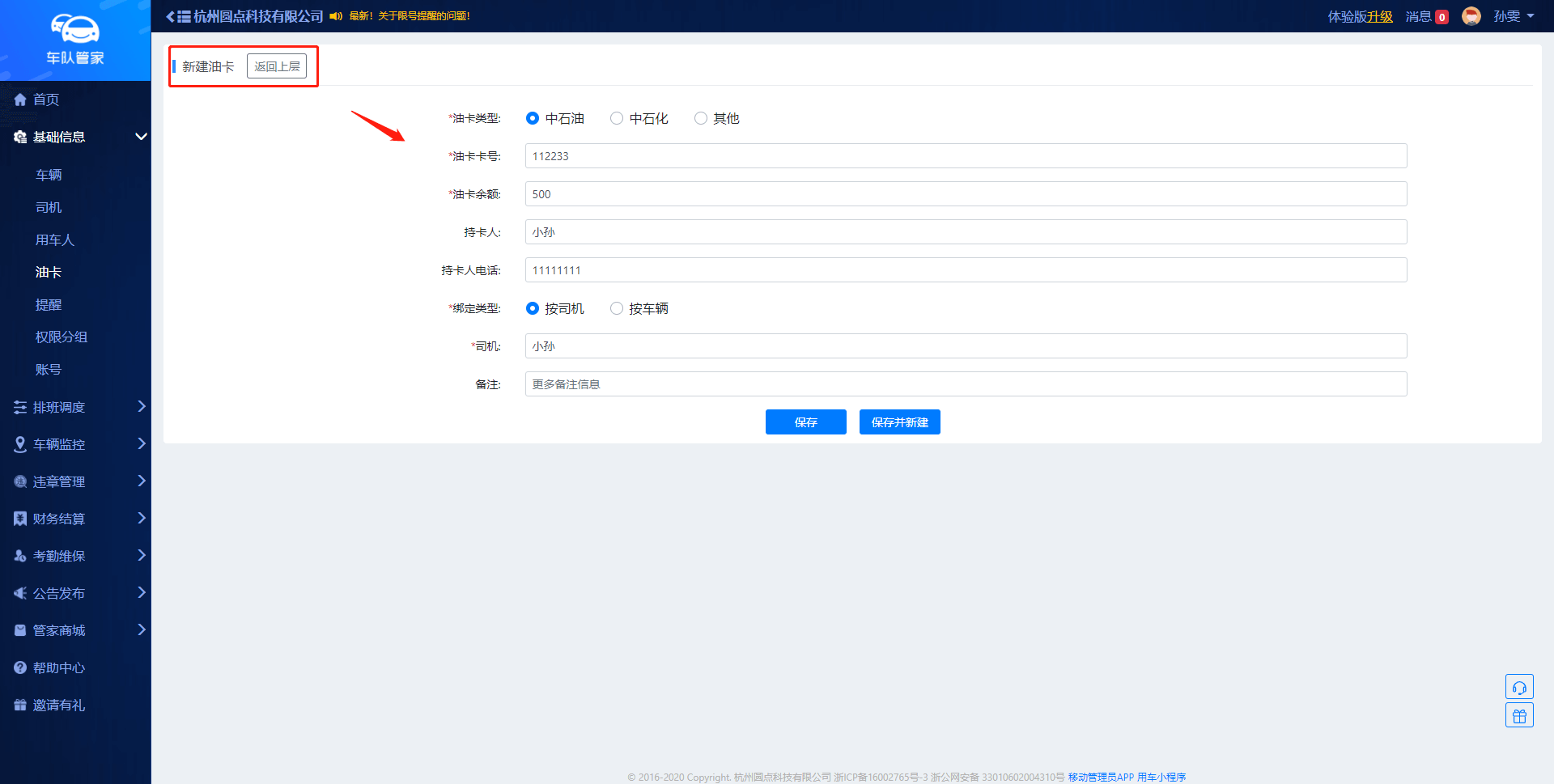 其中带星号的为必填项,管理员可选择把司机/车辆与油卡绑定。