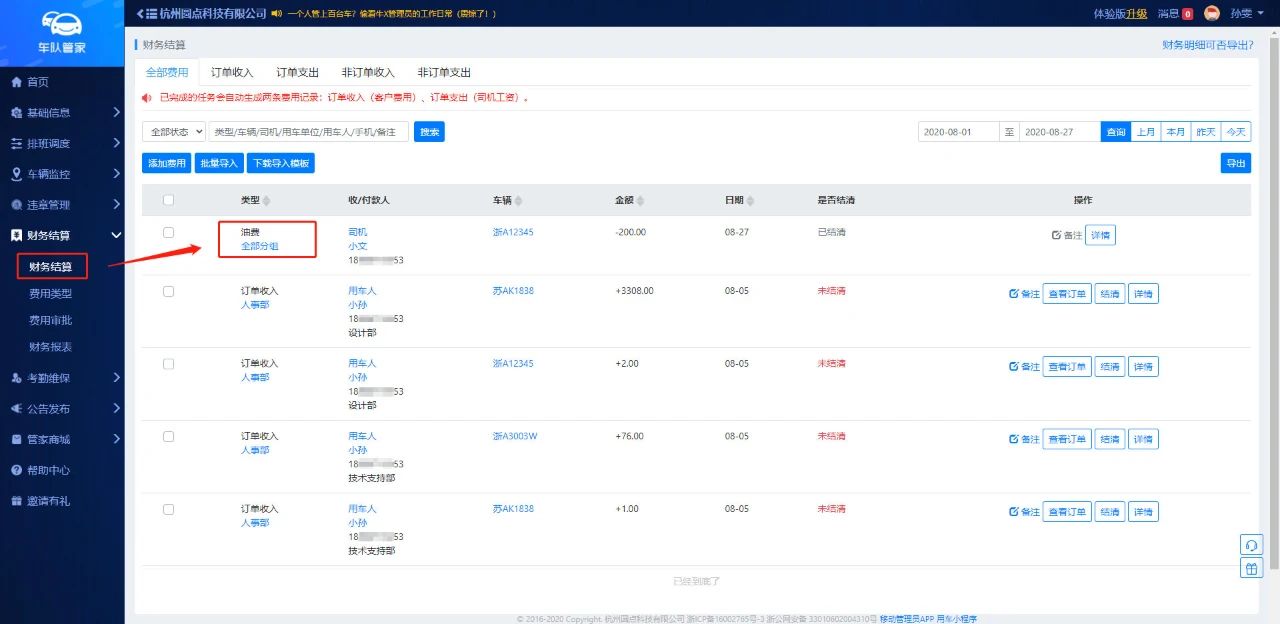 在更新完油卡数据后,后台将实时同步至财务模块,管理员再次到财务管理模块手动添加油耗费用。